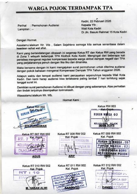 KEDIRI — Ketidakjelasan pencairan kompensasi dampak negatif Tempat Pembuangan Akhir (TPA) Klotok berada di Kelurahan Pojok Kecamatan Mojoroto, untuk Tahun Anggaran 2026 memicu keresahan warga berada di wilayah ring satu. Mereka pun melayangkan surat audiensi kepada Wali Kota Kediri guna meminta kepastian mekanisme verifikasi dan jadwal pencairan dana.