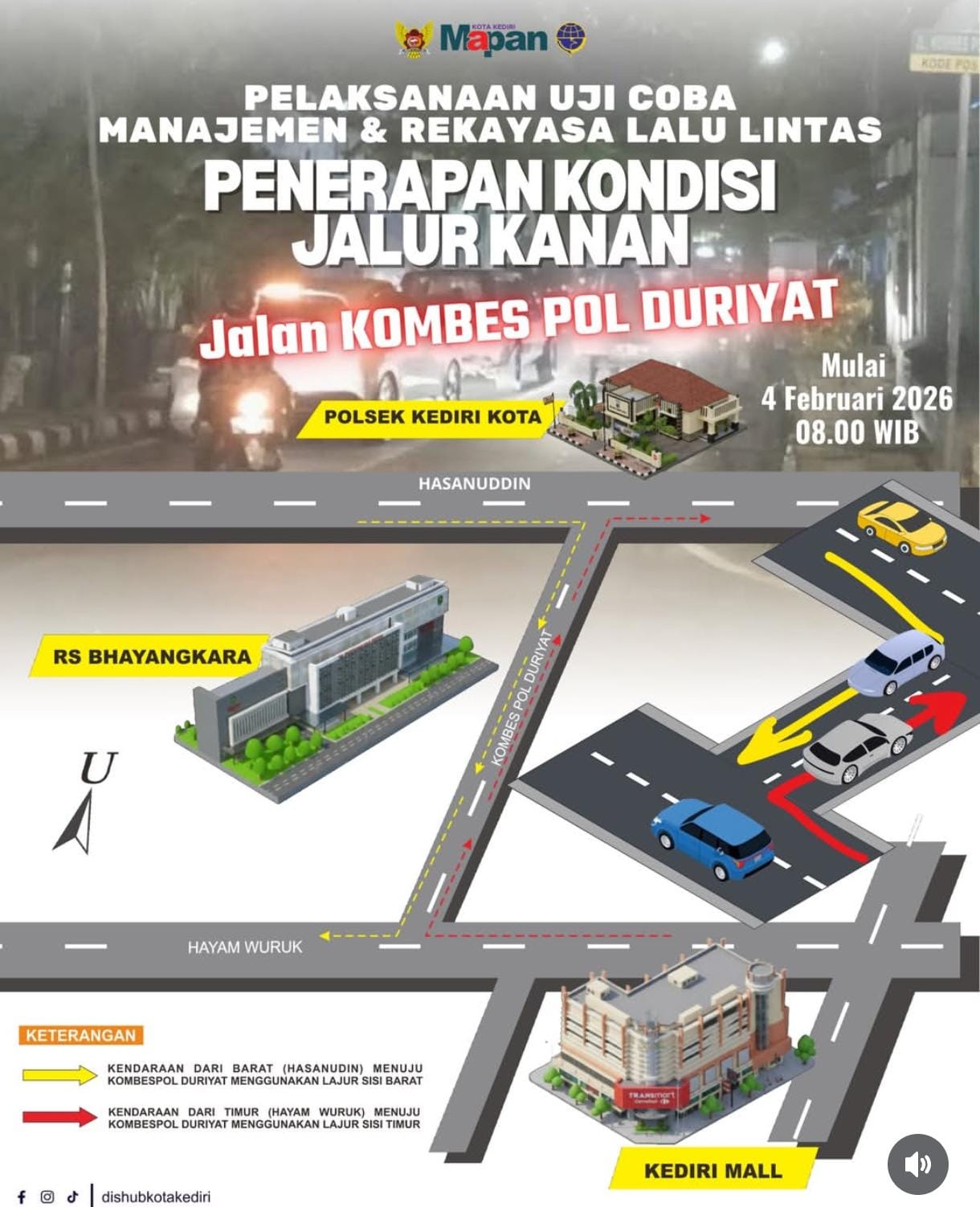 Melalui skema tersebut, kendaraan dari Jalan Hasanuddin maupun Jalan Hayam Wuruk yang menuju Jalan Kombes Pol Duriyat kini dapat langsung menggunakan lajur kanan. Penerapan ini menjadi terobosan baru, sekaligus yang pertama diterapkan di Kota Kediri.