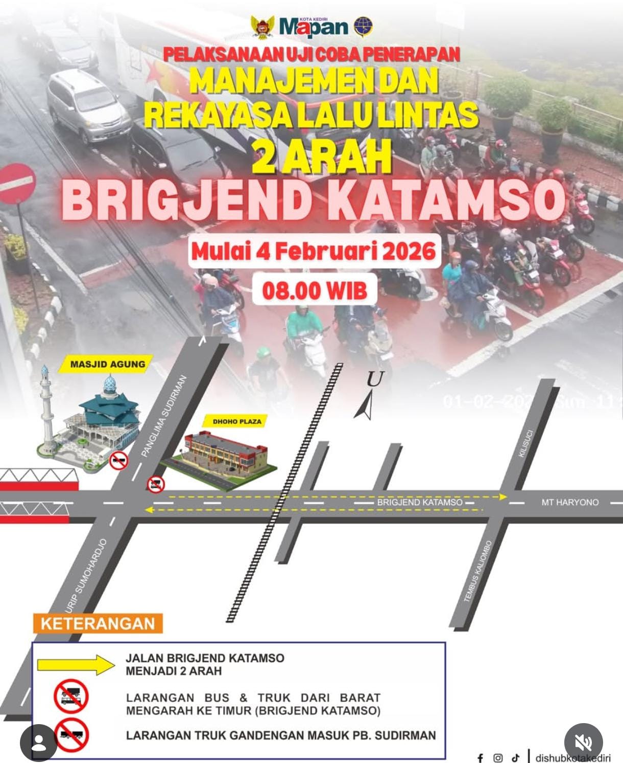 Kepala Dishub Kota Kediri, Arief Cholisudin Yuswanto, menjelaskan bahwa penerapan dua arah di Jalan Brigjen Katamso menjadi bagian dari penataan lalu lintas jangka menengah, sekaligus membuka akses alternatif menuju wilayah timur Kota Kediri.