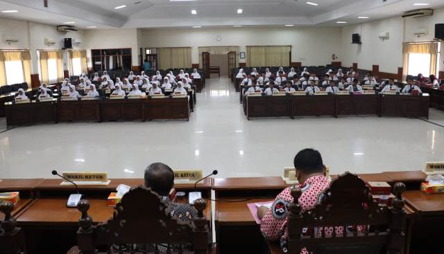 KEDIRI – Layaknya Rapat Paripurna digelar di Ruang Graha Sabba Candha Bhirawa Gedung DPRD Kabupaten Kediri. Biasanya dihadiri para wakil rakyat dari semua partai, namun kali ini yang dihadapi Dodi Purwanto. Merupakan Ketua DPRD Kabupaten Kediri, adalah ratusan siswa-siswi dari SMP Negeri 1 Ngadiluwih.
