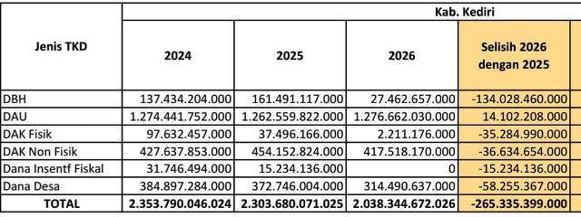 Wakil Bupati Kediri menjelaskan, penurunan anggaran tersebut disebabkan oleh berkurangnya Transfer ke Daerah (TKD) dari pemerintah pusat.