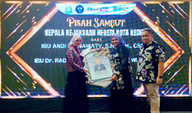 KEDIRI – Suasana hangat bercampur haru mewarnai malam pisah sambut Kepala Kejaksaan Negeri (Kajari) Kota Kediri di salah satu hotel berbintang, Jumat (7/11). Jabatan Kajari resmi beralih dari Andi Mirnawaty, S.H., M.H. kepada Dr. Raden Roro Theresia Tri Widorini, S.E., Ak., S.H., M.H. Acara berlangsung khidmat, dihadiri Wali Kota Kediri Vinanda Prameswati, jajaran Forkopimda, serta berbagai tokoh daerah.