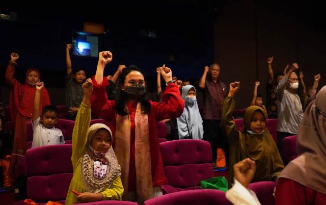 KEDIRI– Kebahagiaan terpancar di mata anak-anak yatim piatu dari 62 Lembaga Kesejahteraan Sosial Anak (LKSA) di Kabupaten Kediri saat mereka mendapat kesempatan nonton bareng (nobar) film “Bus Om Bebek” di bioskop. Kegiatan nobar yang diinisiasi Tim Penggerak PKK Kabupaten Kediri itu diadakan di Golden Theatre, Senin (30/5/2022) sore. Ketua Tim Penggerak PKK Eriani Annisa Hanindhito yang ikut serta mendampingi mengaku bahagia bisa berbagi kebahagian dengan mengajak anak-anak yatim piatu dalam kegiatan nobar.