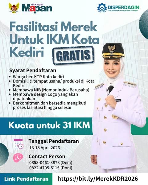 KEDIRI — Upaya memperkuat fondasi hukum bagi pelaku usaha kecil di Kota Kediri terus digencarkan oleh Walikota Kediri Vinanda Prameswati. Salah satunya kini berjalan, melalui program Fasilitasi Merek Gratis yang dihadirkan Dinas Perdagangan dan Perindustrian (Disperdagin), sebagai ikhtiar memberi kepastian sekaligus membuka jalan bagi produk lokal menembus pasar yang lebih luas.