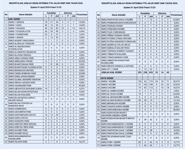 Sementara itu, dari jenjang SMK negeri dan swasta yang tersebar di 77 sekolah di Kediri, tercatat 953 siswa mendaftar. Namun, hanya 399 siswa yang berhasil diterima di PTN.