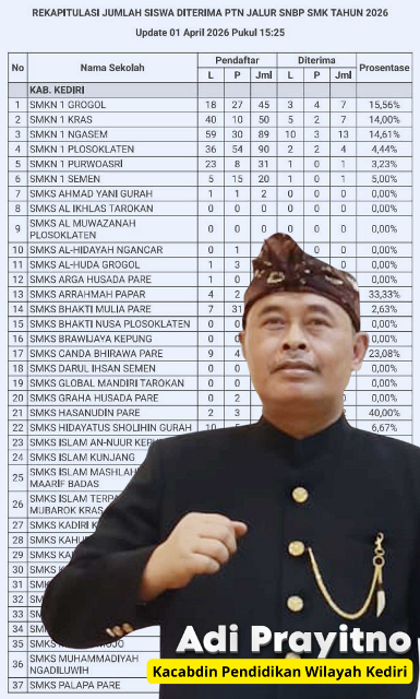Lebih lanjut, Adi menilai peningkatan jumlah siswa yang diterima di PTN tahun ini turut mencerminkan naiknya indeks prestasi pendidikan di wilayah Kediri. Untuk menjaga tren tersebut, pihaknya terus melakukan pembenahan, termasuk melalui inovasi program pendidikan dan penyegaran jajaran kepala sekolah.