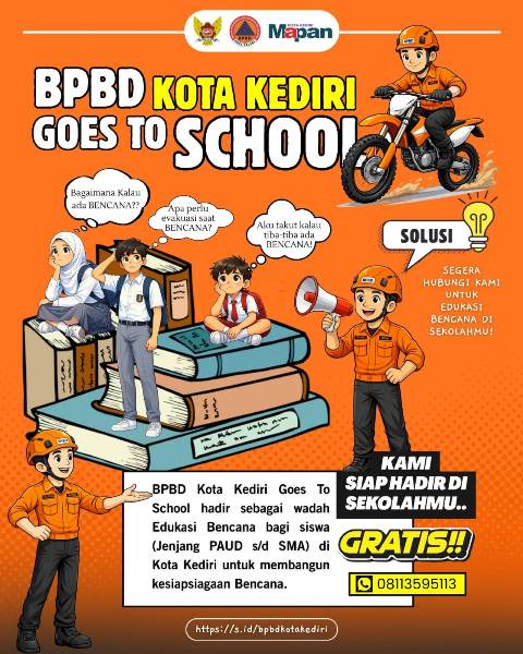 KEDIRI — Upaya membangun budaya sadar bencana terus diperkuat Badan Penanggulangan Bencana Daerah (BPBD) Kota Kediri melalui Program Goes to School. Program ini menjadi bagian dari strategi mitigasi pra-bencana yang menyasar lingkungan sekolah sebagai garda awal pembentukan karakter tangguh bencana.