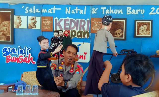 Pemandangan menarik terlihat pada siang hari kemarin. AKP Bowo tampak akrab menghibur seorang anak yang berkunjung ke Posyan Nataru yang berada tepat di depan Alun-Alun Kota Kediri. Dengan memainkan wayang golek, suasana penuh tawa tercipta tanpa sekat antara polisi dan masyarakat.